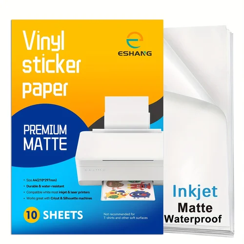 ESHANG A4 10 แผ่นพรีเมี่ยมพิมพ์ไวนิลสติกเกอร์กระดาษสําหรับเครื่องพิมพ์อิงค์เจ็ท Matte สีขาวกันน้ํา, แห้งเร็ว 8.3 × 11.7 นิ้ว
