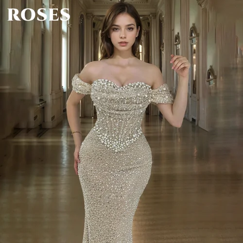กุหลาบเพิร์ลGorgeousพรหมชุดSweetheartปิดไหล่HollowชุดราตรีFishbone Shiny Sequinsชุดอย่างเป็นทางการที่กําหนดเอง