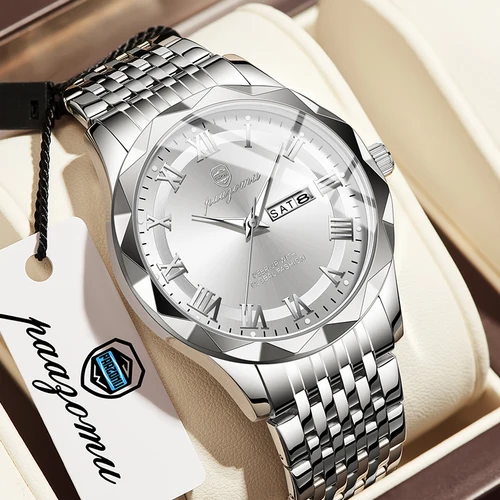 POEDAGAR TOP Original Men นาฬิกากันน้ําวันที่สี่เหลี่ยมผืนผ้า Man นาฬิกาข้อมือตาข่ายสแตนเลสผู้ชายนาฬิกาควอตซ์ชาย