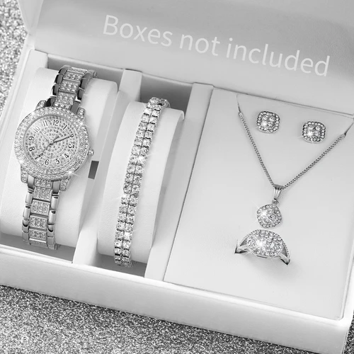ชุดเครื่องประดับนาฬิกาควอตซ์แอนะล็อกสายรัดเหล็กทองนาฬิกาผู้หญิงเพชรเต็มรูปแบบแฟชั่น6ชิ้น (ไม่มีกล่อง)