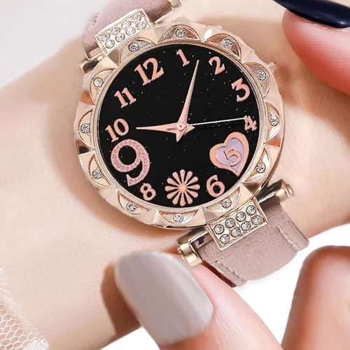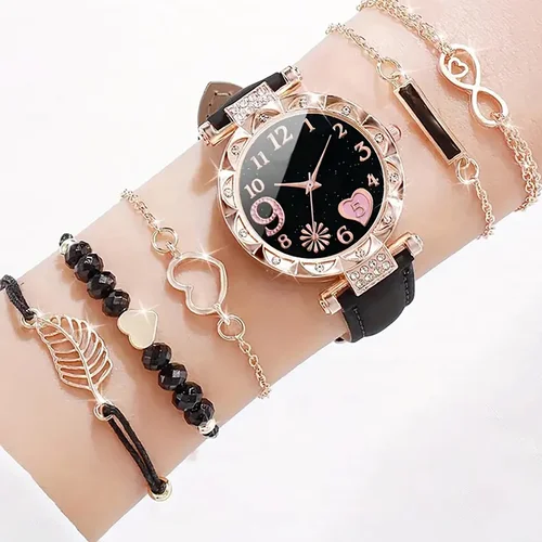 6PCS ผู้หญิงแฟชั่นนาฬิกาควอตซ์หรูหราหนังสีชมพู Band Analog นาฬิกาข้อมือสุภาพสตรีนาฬิกาผู้หญิงชุดสร้อยข้อมือนาฬิกา