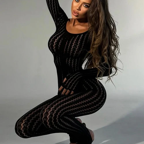 ข้อเสนอที่ดี Sibybo Sheer Hollow Out Jumpsuits ผู้หญิงฤดูร้อนรอบคอยาวแขนยาวยืด One Piece Jumpsuit Rompers บางเซ็กซี่ Overalls เพียงต้องการ THB 630.14 ตอนนี้มีส่วนลด 30.03 %