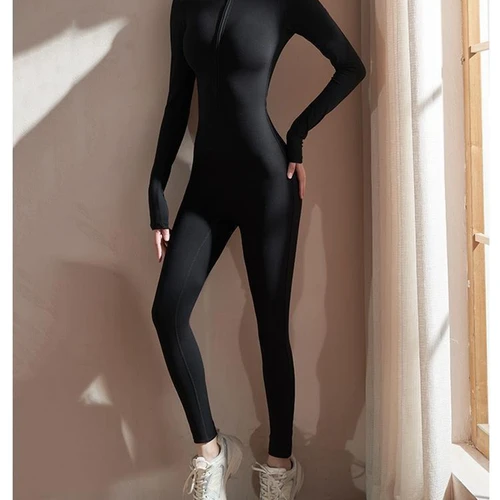 ชุดสตรีแขนยาวโยคะ SLIM FIT ยืด One Piece Romper เซ็กซี่ฟิตเนสหญิงสีดํา Basic Sportwears แน่นซิป