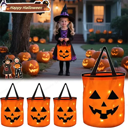 ไฟ LED ตกแต่งฮาโลวีนเคล็ดลับหรือรักษาถังพร้อมถุงขนมฟักทองแบบพับได้ปาร์ตี้วันขอบคุณพระเจ้าตะกร้าของขวัญปาร์ตี้