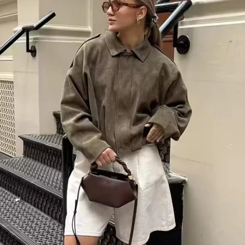 เสื้อแจ็คเก็ตบอมเบอร์แฟชั่นผู้หญิงสไตล์ฤดูใบไม้ร่วง TFMLN เสื้อโค้ทโอเวอร์ไซส์แขนยาวทรงโคมไฟเนื้อนุ่มสบาย เสื้อคลุมตัวสั้นมีซิปสำหรับผู้หญิง