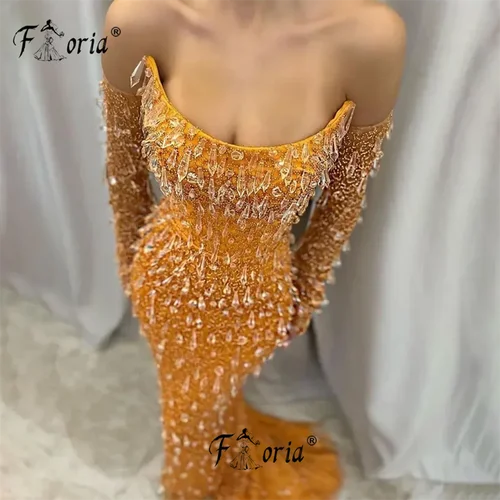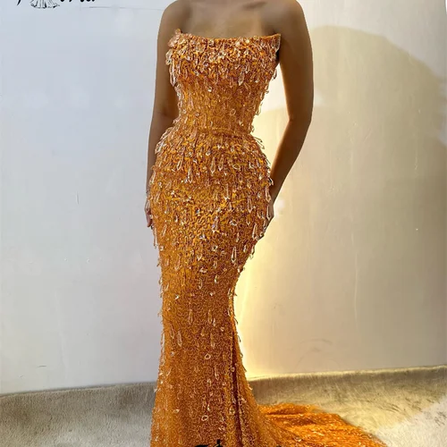 คริสตัลที่ละเอียดอ่อนสีส้ม Mermaid ชุดพรรคอย่างเป็นทางการ Strapless Beaded งานแต่งงานชุดราตรี Couture หินคําชุดชื่อเสียง