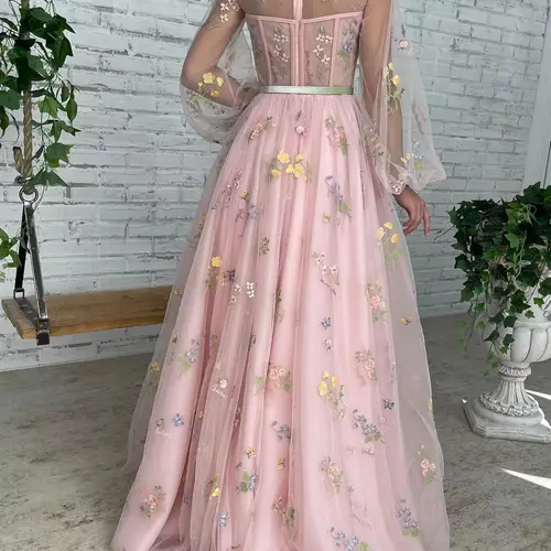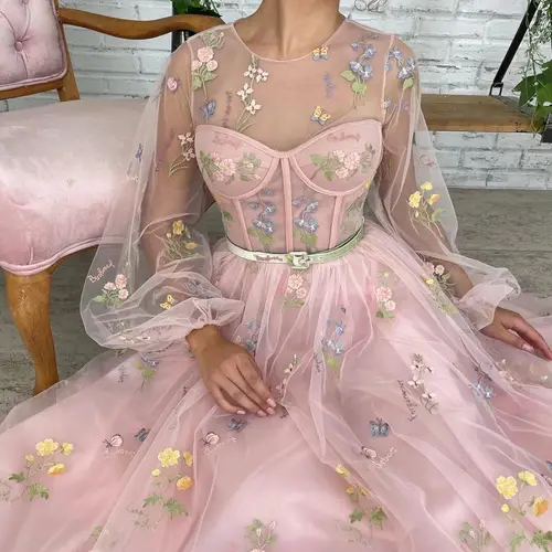 ข้อเสนอที่ดี ผู้หญิง Puffy Sleeve Tulle Prom Dresses ดอกไม้เย็บปักถักร้อยยาวอย่างเป็นทางการ Evening Party Gowns พร้อมกระเป๋า เพียงต้องการ THB 7475.68 ตอนนี้มีส่วนลด 61.00 %