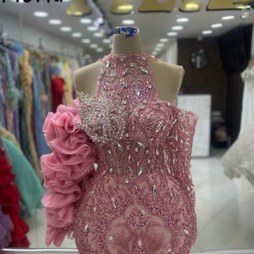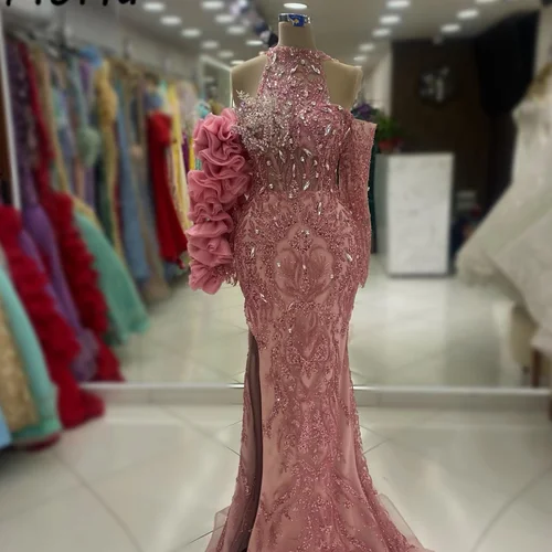 Charming สีชมพู Mermaid ชุดราตรีอย่างเป็นทางการ Halter คริสตัล Ruffles ปิดไหล่ชุดราตรี Couture Slit งานแต่งงาน Gowns