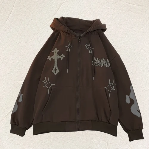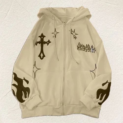 เสื้อสเวตเตอร์2023มีฮู้ดแบบหลวมคู่ผ้ากำมะหยี่ปักลายเปลวไฟแบบชาวยุโรปและอเมริกันฤดูใบไม้ร่วง/ฤดูหนาว