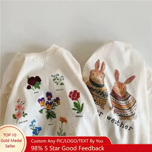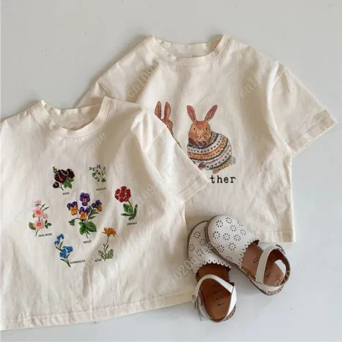 เสื้อยืดเด็กผ้าฝ้ายลำลอง 1-10 ปี ฤดูร้อน 2025 เสื้อยืดเด็กผู้หญิงแขนสั้นลายการ์ตูน เสื้อเด็กผู้ชายเด็กผู้หญิงลายกระต่ายดอกไม้